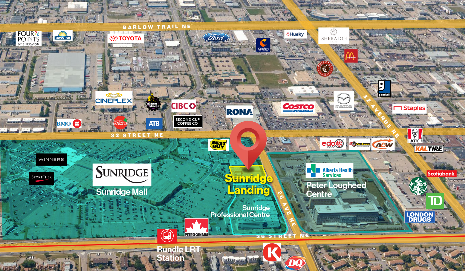 Skip to content Property Description Description: • Unmatched Retail Positioning – Directly adjacent to Sunridge Mall with shared access to NE Calgary’s premier shopping destination. • Premier Shopping Node – Located within the greater Sunridge retail hub and steps from the high-traffic 32 Avenue/36 Street corridors. • Surrounded by National Anchors – Immediate proximity to Costco, RONA, Cineplex, and Best Buy. • Healthcare Traffic Driver – Minutes from Peter Lougheed Centre, NE Calgary’s major hospital and employment hub. • Transit-Oriented Convenience – Easy walk to Rundle station (C-Train access). • Exceptional Connectivity – Quick access to 16 Ave / Hwy 1, Barlow Trail, Deerfoot Trail, 32 Avenue & 36 Street NE. • Ample On-Site Parking – Designed for convenience with generous customer parking.